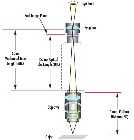 DIN and JIS have historically been used when considering a classic compound microscope. Some microscope manufacturers prefer to list the tube lens length by the optical properties instead of the mechanical. For a DIN standard objective, this changes the tube lens length to 150mm because the eyepiece is imaging the intermediate image plane (Figure 8). Lastly, there is a dimension typically listed for objectives to allow the user to consistently know what length it is: the parfocal distance (PD). The parfocal distance is the distance from the flange of the objective to the object under inspection. For DIN objectives this distance is a standard 45mm and for JIS is it 36mm (Figures 8 and 9).
