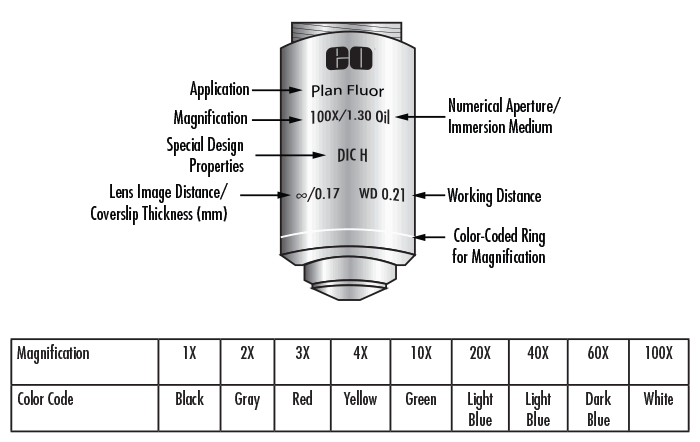 Eyepieces and objectives both have magnification that each contribute to the overall system magnification. Magnification is usually denoted by an X next to a numeric value. Most objectives contain a colored band around the entire circumference of the body that indicates their magnification (Figure 7). For example, a yellow band denotes a 10X magnification.