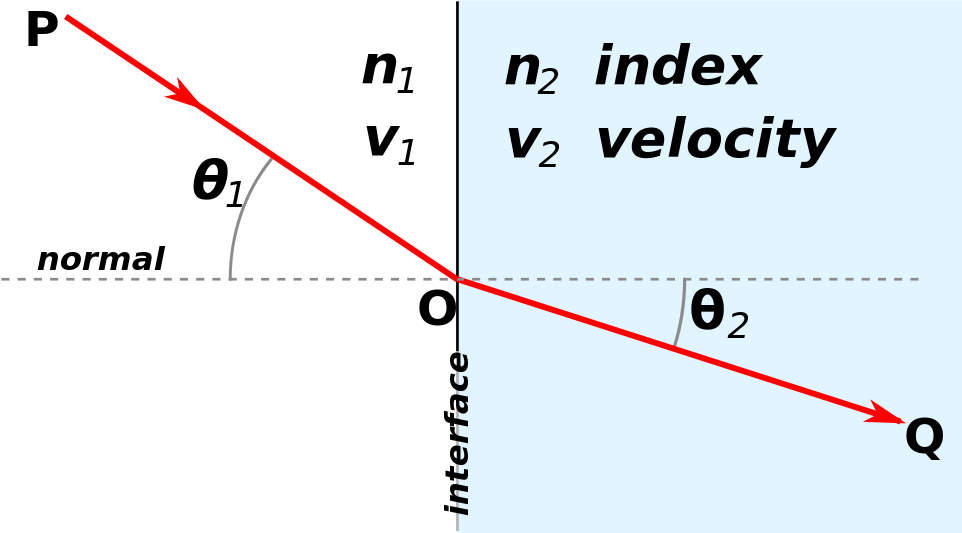 For light, refraction can be described via Snell's Law, which states that the ratio of the sines of the incident light's angle ($ \theta_1 $) and the angle of refracted light ($ \theta_2 $) is equal to the ratio of the phase velocities ($ \tfrac{v_1}{v_2} $) in the two materials, or equivalently to the indices of refraction ($ \tfrac{n_2}{n_1} $) of the materials: