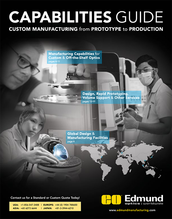 From prototype to volume production, off-the-shelf or custom, Edmund Optics can provide the optical components to meet your specific need. This useful guide offers an overview of Edmund Optics’ global design and manufacturing services, including full specifications and production capabilities for Edmund Optics’ most popular optics.