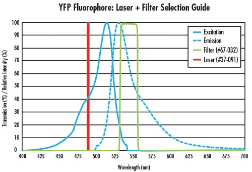 The figures below give examples of popular fluorophores and match an appropriate illumination laser and emission filter that could be used within a high performance fluorescence imaging or microscopy system. The two blue curves represent the fluorophore’s excitation and emission bands, while the green curve shows the transmission profile of a filter that would adequately isolate the peak transmission from the emission band.