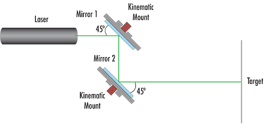 To align a laser beam, the angular and translational displacement of the beam must be controlled. This can quickly complicate the alignment setup by requiring multiple optical components that may take up valuable table space. There are two basic configurations that utilize kinematic mounts, though, that are effective and simple solutions for aligning lasers in space-sensitive applications.