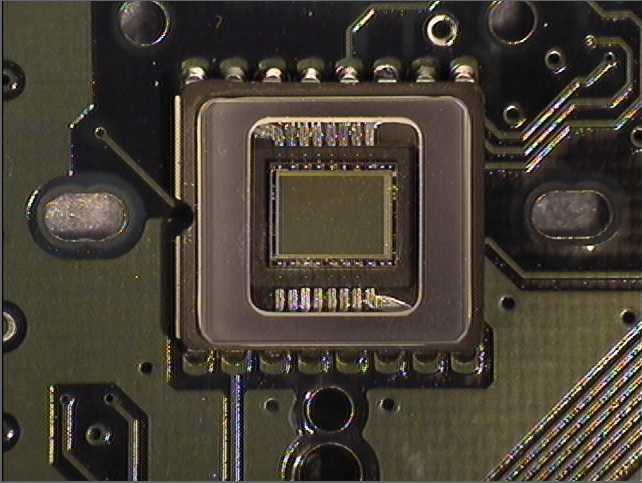 In Figure 5, a linear polarizer was placed in front of the lens in a machine vision system to remove obfuscating glare such that an electronic chip could be clearly seen. The left image (without polarizer) shows randomly polarized light scattering off of the many glass surfaces between the object and the camera sensor. Much of the chip is obscured by Fresnel reflection of the unpolarized light. The image on the right (with polarizer) shows the chip without glare obscuring any of the object details, allowing the chip to be viewed, analyzed, and measured without obstruction.