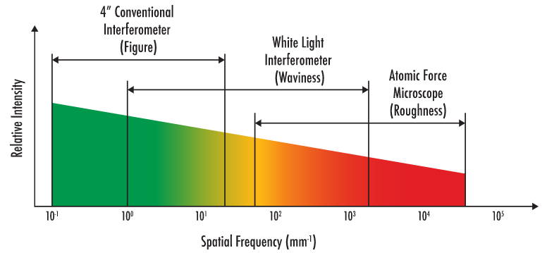 Every tool used for metrology has its own unique measurable spatial frequency range. Figure 1 displays the overlapping spatial frequency ranges of three different devices commonly used to measure surface errors: conventional interferometry, white light interferometry (WLI), and atomic force microscopy (AFM).
