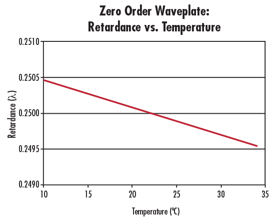 As their total retardation is a small percentage of the multiple order type, the retardation for zero order waveplates is far more constant with respect to temperature (Figure 6) and wavelength variations (Figure 7). In situations requiring greater stability or requiring greater temperature excursions, zero order waveplates are the ideal choice. Application examples include observing a broadened spectral wavelength, or taking measurements with an instrument used in the field.