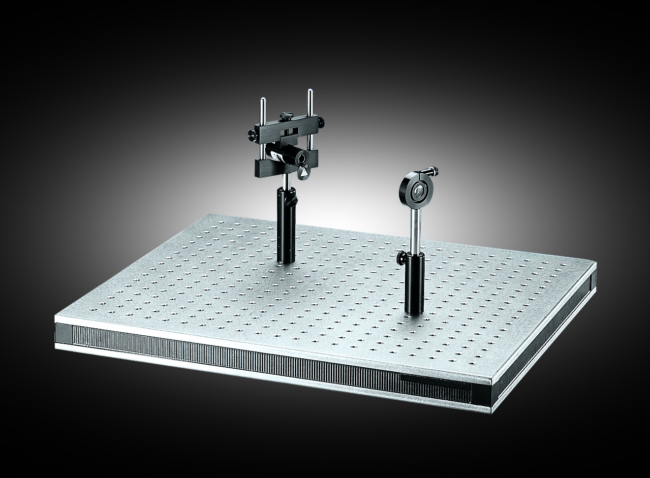 The optical table is the foundation of your setup. For sensitive experiments, it is strongly recommended to invest in a vibration-isolated optical table, as its damping system reduces environmental disturbances such as shocks and vibrations. This ensures a stable and reliable beam path. The surface of an optical table is covered with a regular hole pattern of threaded holes that allow secure mounting of optomechanical components. Breadboards (as shown in Figure 1), also called bench plates, are smaller plates with the same hole pattern. They can be placed on top of a table or any other surface, offering flexibility in positioning, modularity, or even transportability of your setup.